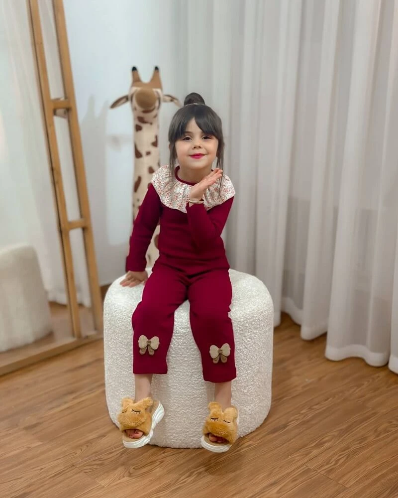 ست بلوز و شلوار کبریتی آلبالویی طرح یقه چین گلدار